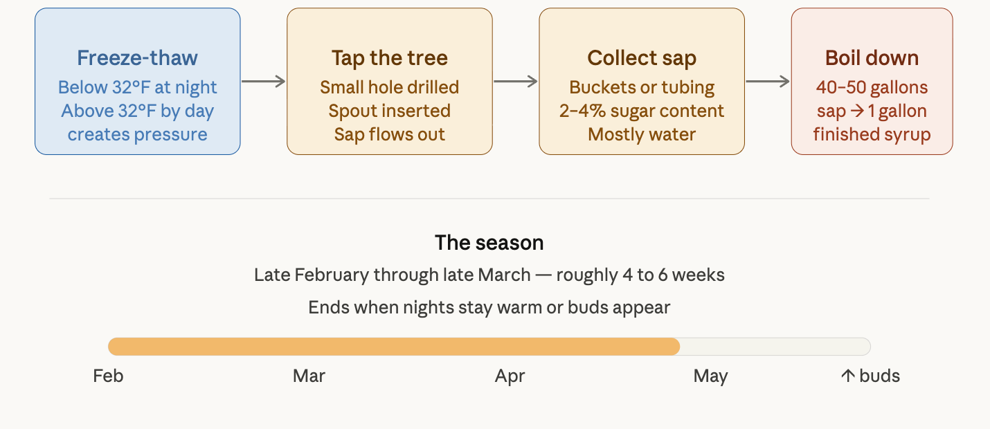 Sometime in late February or early March, something quiet happens in the hills of New England. The days stretch a little longer. Temperatures climb above freezing in the afternoon and drop back below it at night. And inside the sugar maple trees standing in their hillside groves, sap begins to move.